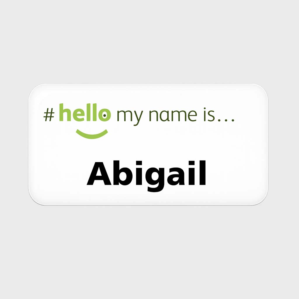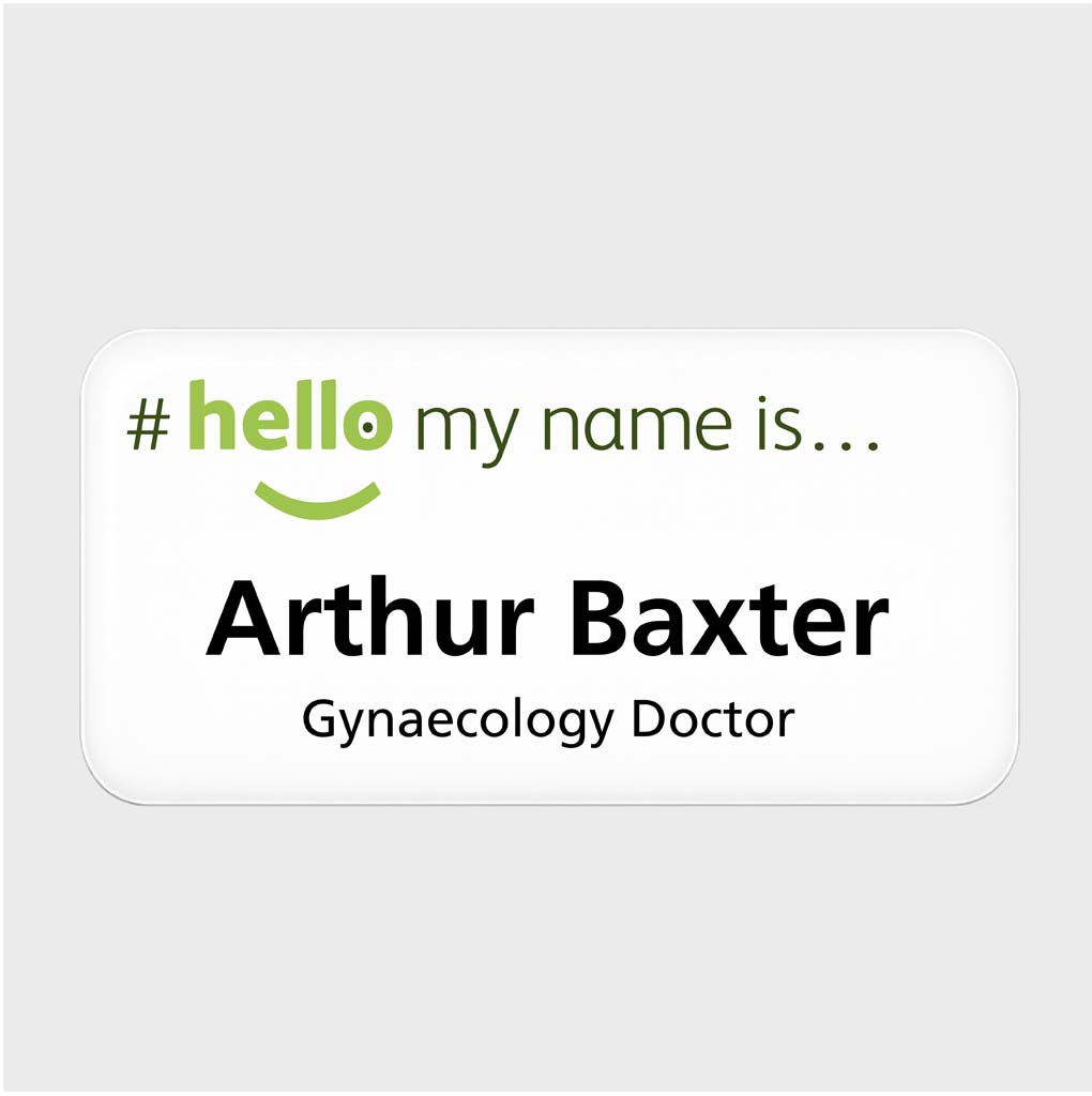 “Hello my name is” White Frameless Domed Name Badge – 76mm x 38mm, with 1 to 3 Lines of Text & Optional Logo